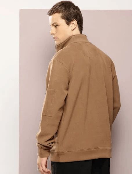 Beige self design knitted jacket, has a stand collar, 2 pockets ,has a zip closure, long sleeves, straight hemline, without lining engineered