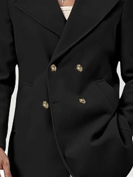 Black solid double-breasted overcoat, has notched lapel collar, long sleeves, button closure, two pockets, a straight hem