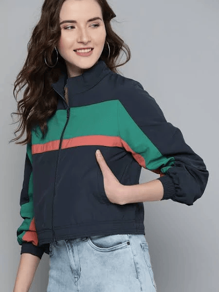 Navy and green striped bomber jacket, has a mock collar, 2 pockets, zip closure, long sleeves, straight hem, and attached lining
